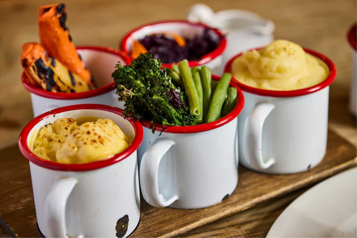 A Grand Yorkshire Pudding, light and golden, is perfect for soaking up that glorious gravy. The Maris Piper Roasted Potatoes are crispy on the outside and fluffy on the inside, while the Cauliflower Cheese is creamy, cheesy, and utterly irresistible. To complete the meal, the Cream Mash Potato is smooth and indulgent, just like mum used to make.